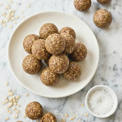 Ingredients: Rolled oats, dates, desiccated coconut, whey protein powder, maple syrup, salt, coconut oil.